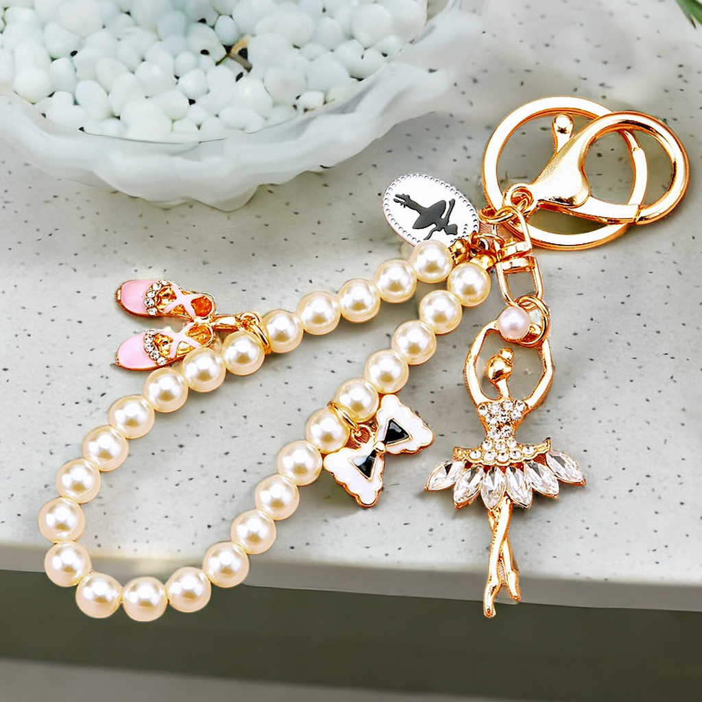 A beautiful bag charm with ballerina girl, ballet shoes, and white pearls chain