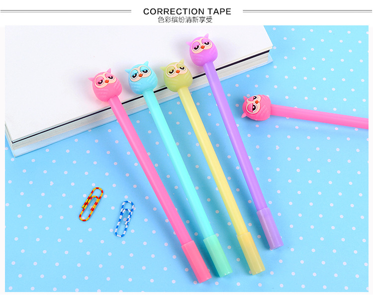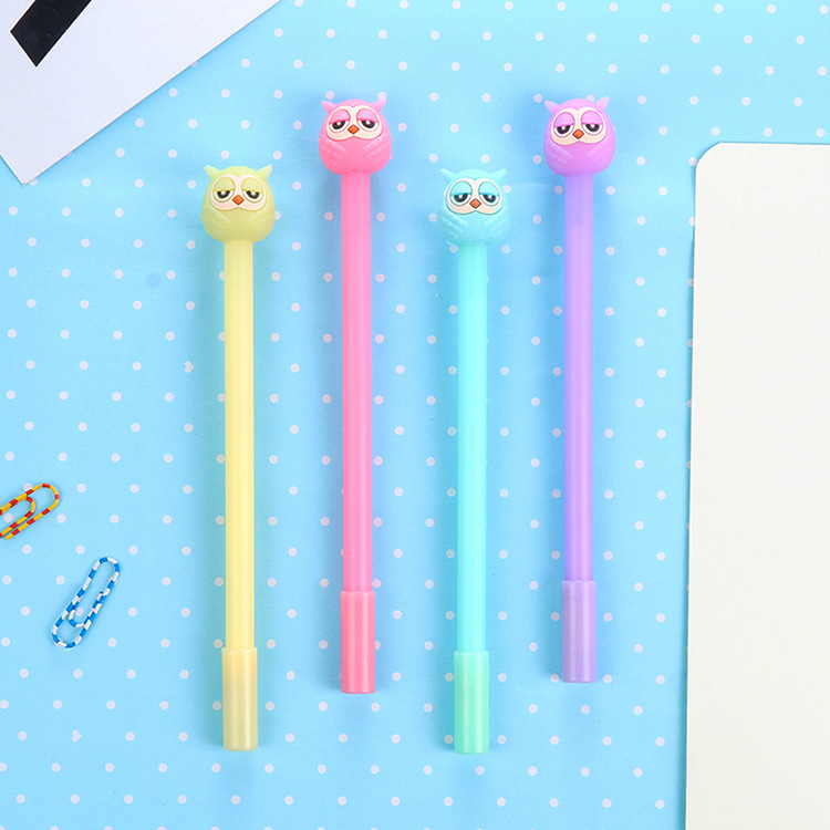 Very cute owls ballpoint gel pens in blue, yellow, pink and purple.
