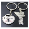 Silver metal couple keyrings / lovers puzzle key chains in love heart shaped lock and key with engraved 'I love you' and 'I miss you' message design, are novelty and unique gifts for boyfriend / girlfriend, couples, lovers and partners.