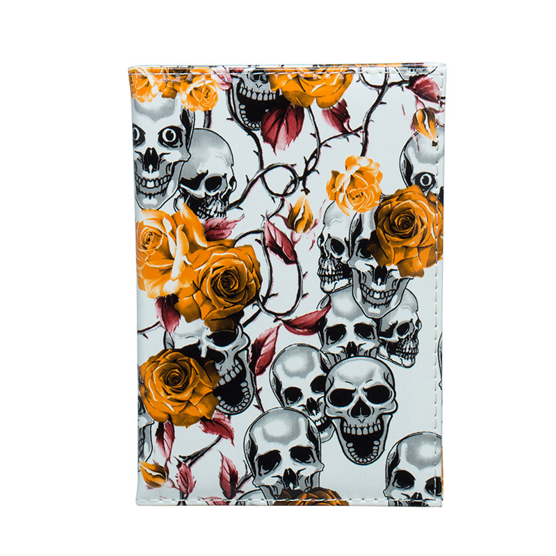 Luxury Skeleton Skulls and Rose Flowers Patterned PU leather passport cover available in different colours.
